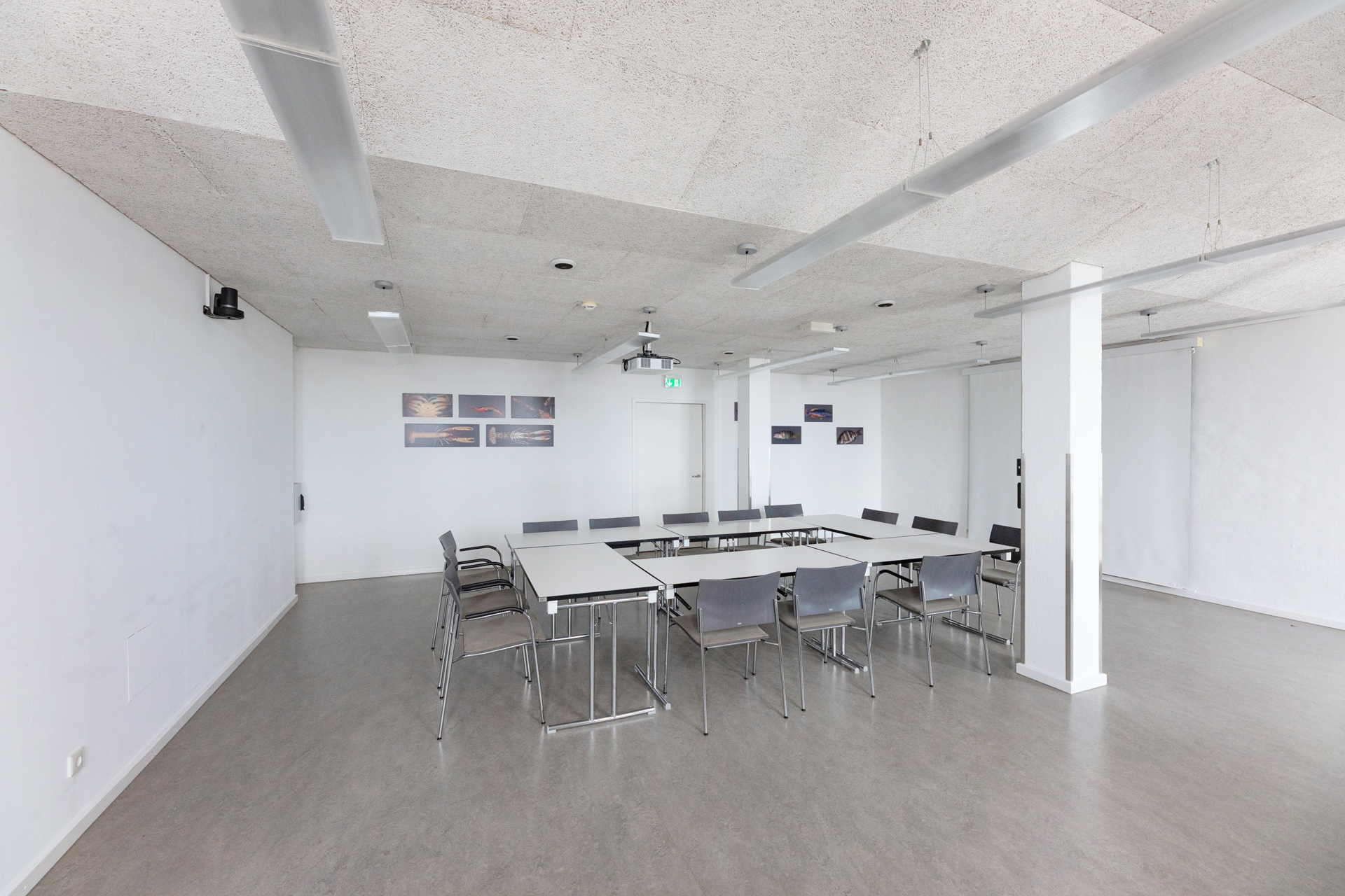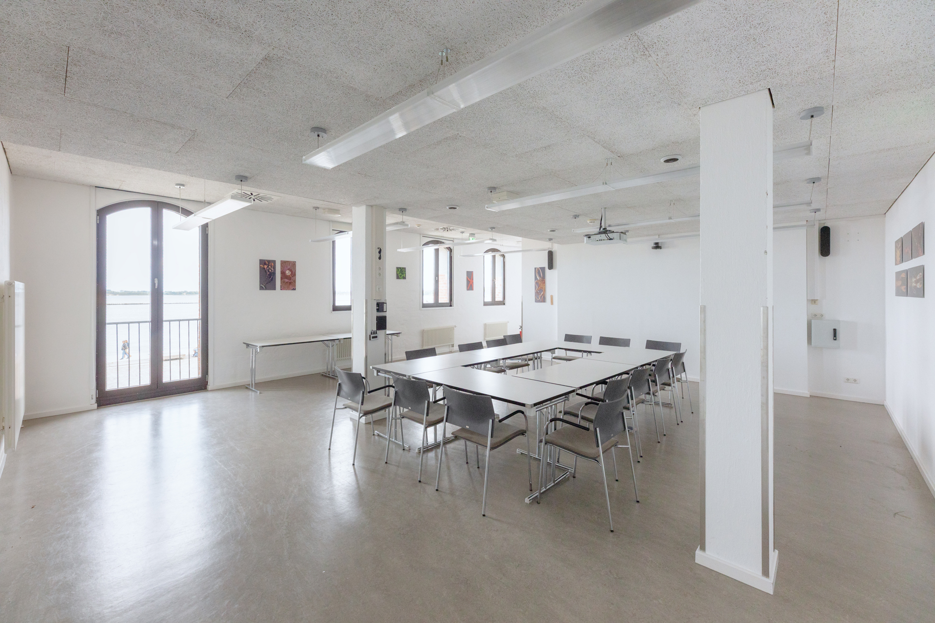 Eine Etage darunter befindet sich ein kleinerer Seminarraum, der durch seine kompakte Größe besonders für Workshops, Schulungen und Weiterbildungen geeignet ist. Unterschiedliche Bestuhlungsvarianten sind auch hier möglich. Durch die Fenster eröffnet sich ein weiter Blick – bis zur Insel Rügen.