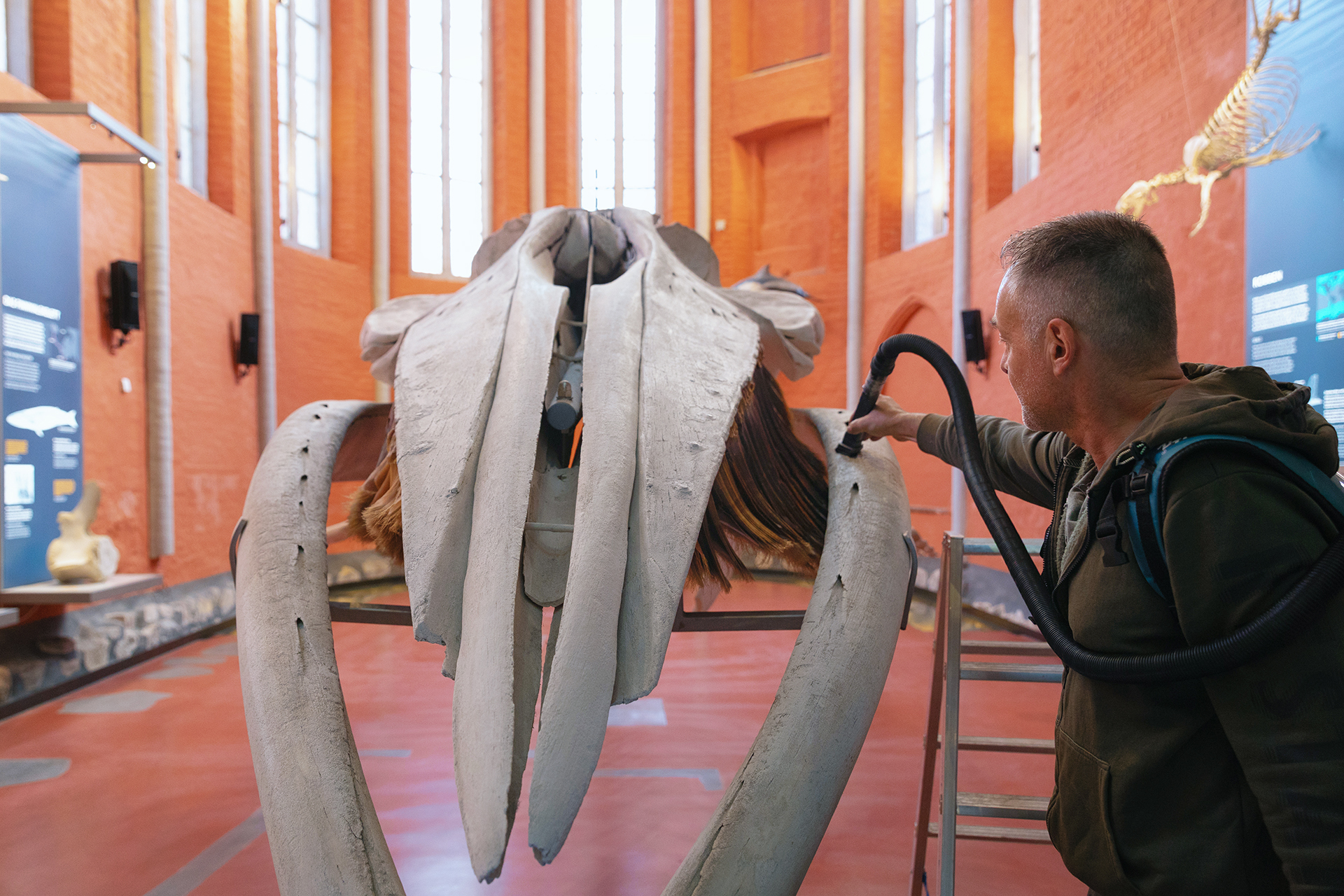 Das Finnwalskelett im Chor der Katharinenhalle benötigt – ebenso wie alle anderen Exponate – regelmäßig eine Reinigung. Dazu wird das eine Tonne schwere Skelett aus luftiger Höhe am 8. April herabgelassen. An diesem Tag bietet sich Ihnen die sehr seltene Gelegenheit, die Finnwalknochen auf Augenhöhe und aus nächster Nähe zu betrachten.